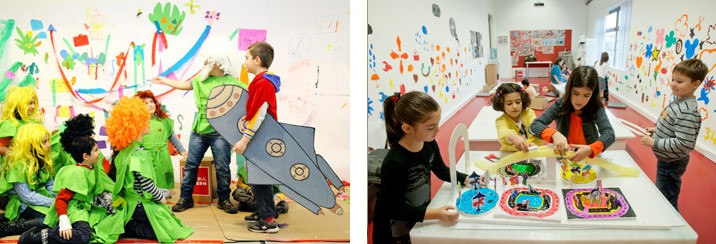 Bu atölyede çocuklar; renklerle, lekelerle ve farklı sanat malzemeleriyle çalışarak hayal güçlerinin sınırlarını zorluyor, bugünün ve geleceğin kostümlerini tasarlıyor.